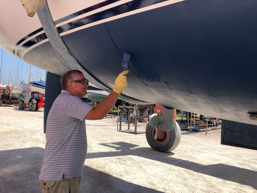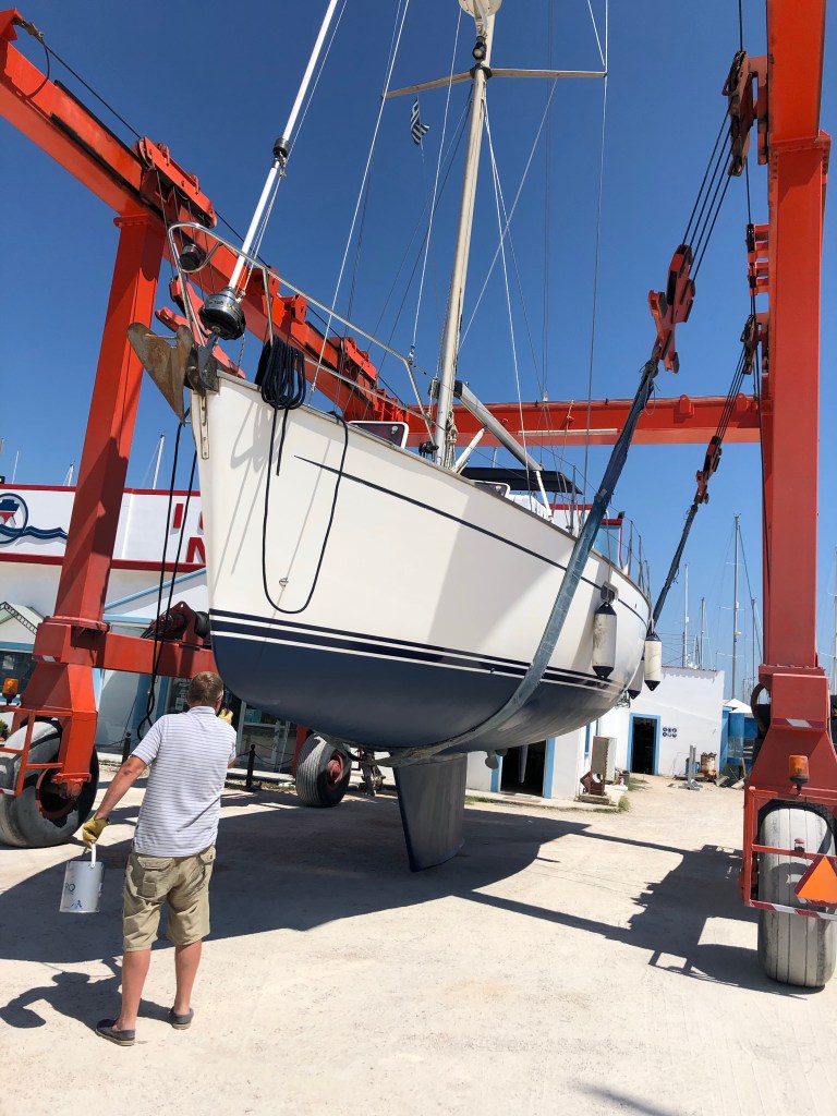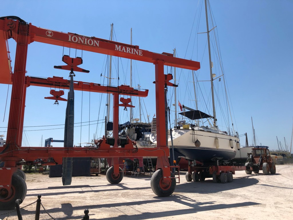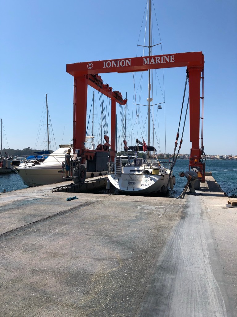 Launch day, the guys at the Ionion Marine came with their tractor to collect ZigZag then took her off the stand and to the lifting crane ready for launch. We were then able to touch up the anti foul over the patches where the stand had been before launch.