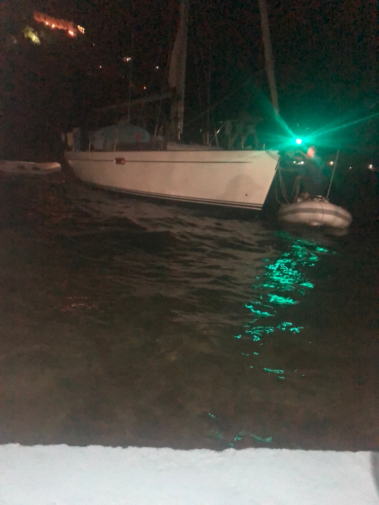 Whilst in the taverna later, we noticed a boat adrift heading towards the beach and taverna, my first thought was that it was our boat as it was the same make and looked identical in the dark! Fortunately we realised that it wasn’t. Paul alerted the owner of the restaurant, some diners who had arrived by dinghy with a large engine went to help, by now the boat was aground (on sand). Luckily they eventually managed to pull them off without any apparent damage.