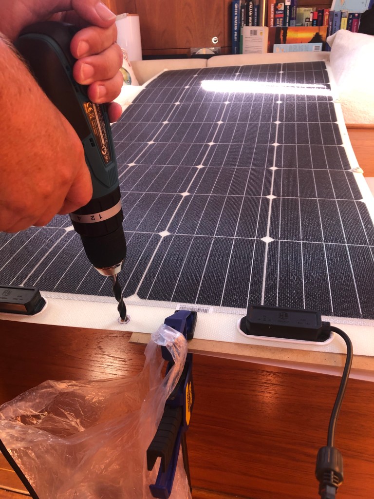 Originally we had planned to have a stainless steel arch made to hold solar panels but due to the delay in getting here and the season being cut short we decided to take matters into our own hands, and install two flexible panels on top of the Bimini.