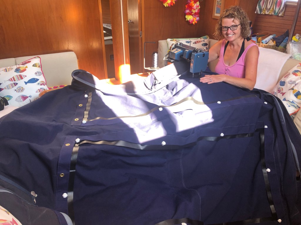 Once it was all marked up we removed the Bimini to sew the frame onto it. We have a heavy duty Sailrite sewing machine on board, it has an engine almost as big and heavy as the boat engine but as we were anchored we didn’t have electric to run it, so had to hand crank it. After a while I had to call in extra muscle to help, Paul threw his full weight into the job while I just sat and carried out the highly skilled task of guiding the needle. (It was just like having an electric motor, not sure that Paul would agree!)