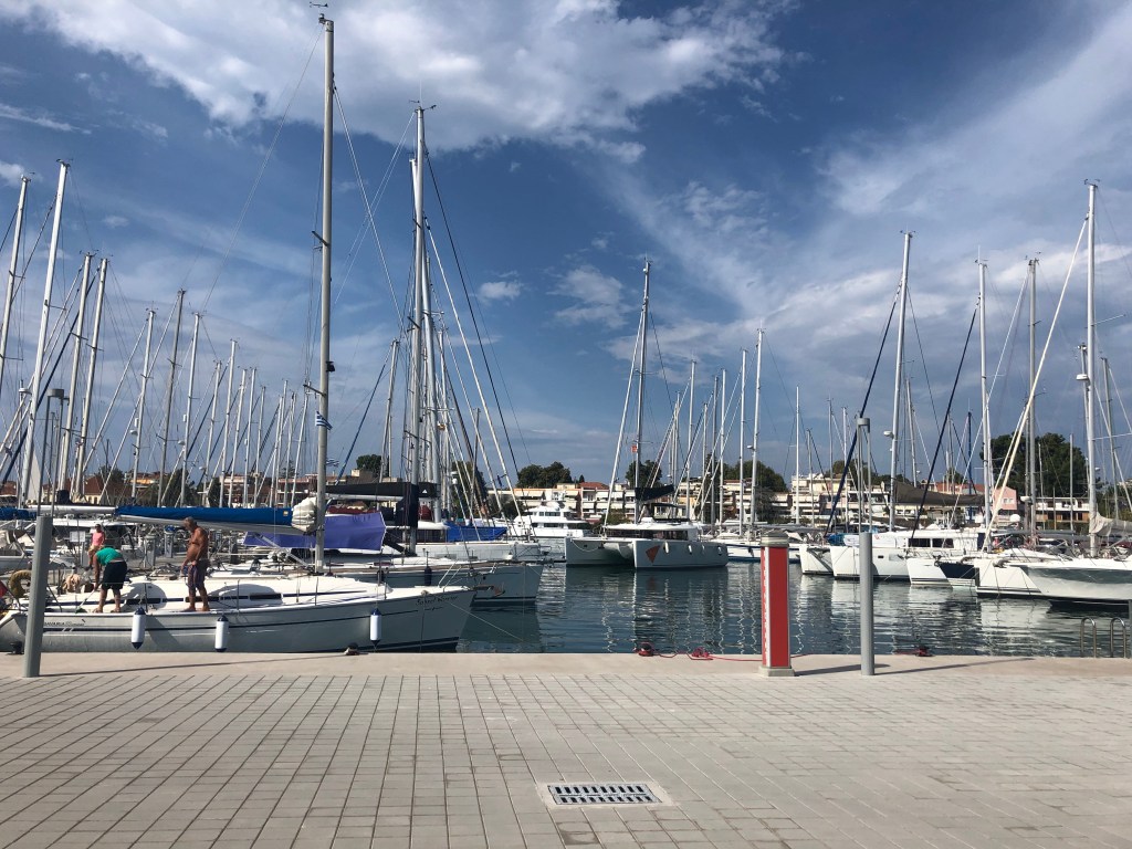 We contacted two marinas and were told there was no space so headed towards Preveza which has a new marina only opened last year. As we approached we called them on the VHF radio and we’re told to wait outside the entrance and they would call us. Along with several other boats all trying to get in we waited….and waited, at this point we didn’t even know if they had space for us! We could hear everyone calling or chasing up for a response and they were all being told to ‘WAIT!’, after about 30 mins we got a call asking for details of our boat, then told again to wait, this was good news as at least they hadn’t forgotten about us!