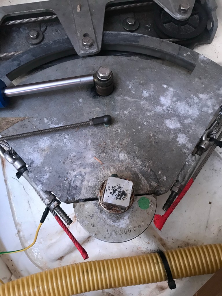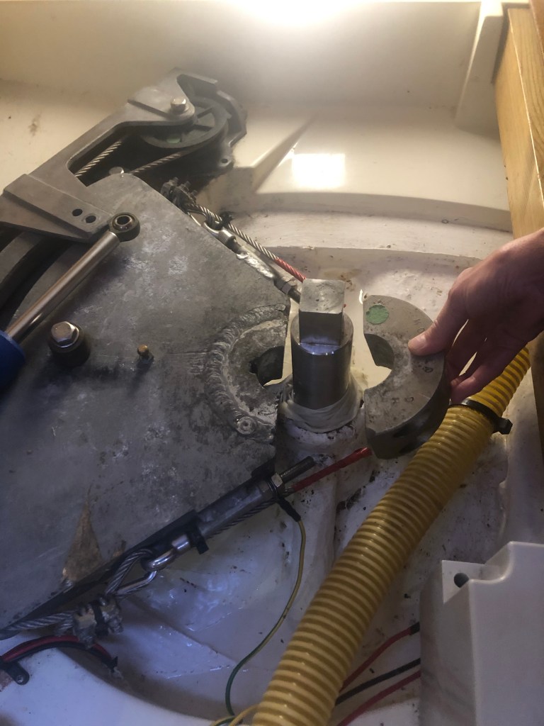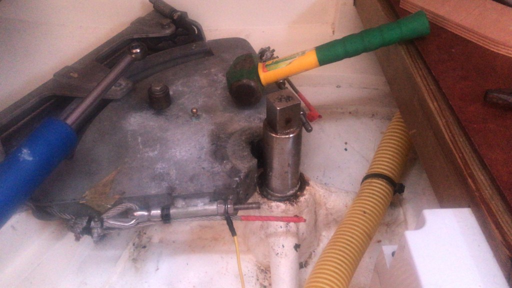 Eventually he managed to release the bolts enabling the steering quadrant to be disconnected from the rudder (The hammer came in very useful)