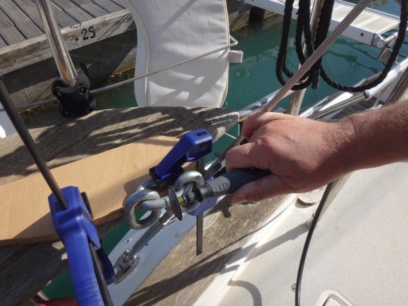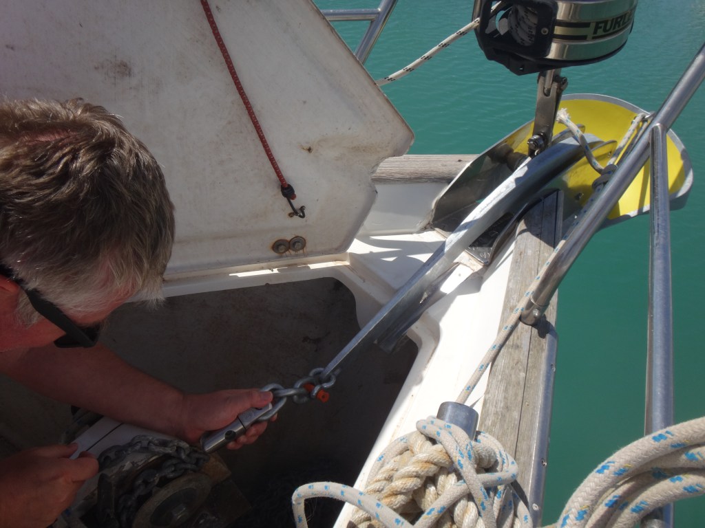We then had to cut a link of thick chain to connect the anchor to the new swivel and chain.