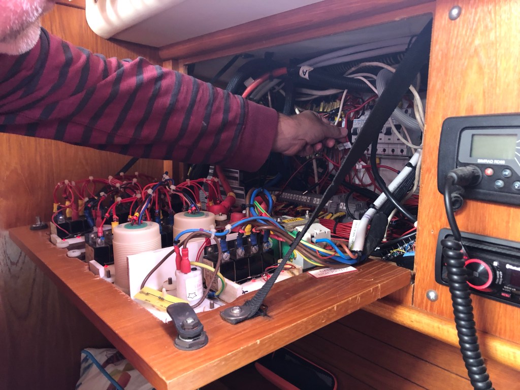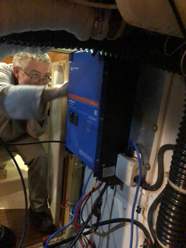 The first job was to install the inverter charger in the engine room to replace the old smaller charger. This weighed 18kg so manoeuvring and placing this unit in a confined space was no mean feat, fortunately it fitted in the space available with millimetres to spare.