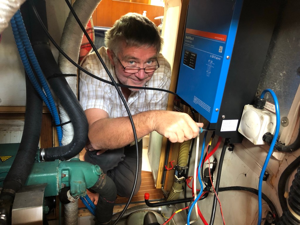 This then needed to be correctly wired in to the boats 240 volt circuit. Having experienced a few sparks flying during the battery installation, we engaged the assistance of one of our fellow winter liveaboards in the marina to help us with this as he is a professional electrician with the required skills and experience. (Don’t worry, Paul is under full supervision)!