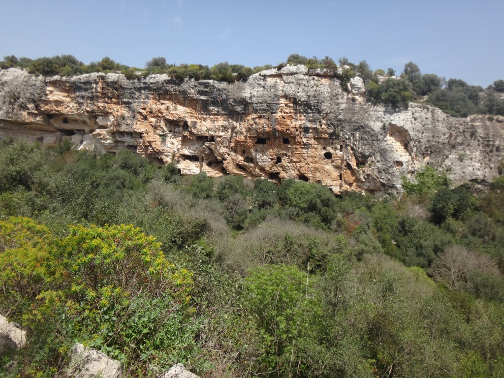 We went on the weekly hike with the group to Cava d’Ispica. Here there is a canyon that cuts through the Hyblaean mountains for 13 km, between the towns of Modica and Ispica, it is 100 meters deep in some places, and a half-kilometer wide. Carved by erosion of the river Pernamazzoni in its upper parts and by Busaitone in the lower parts.