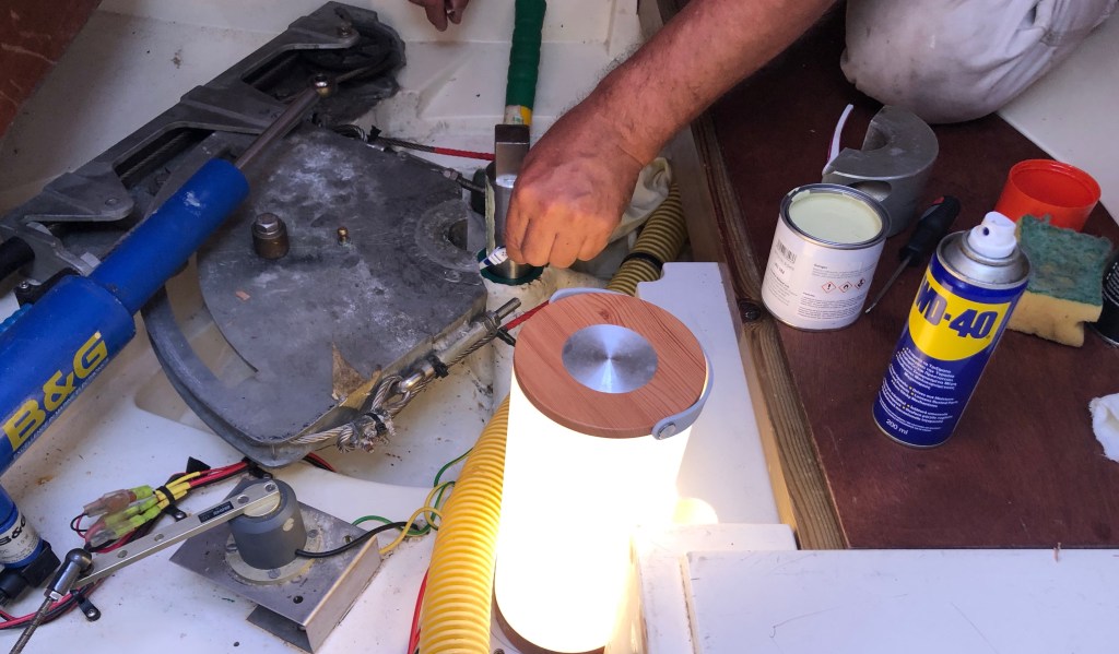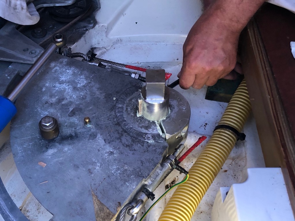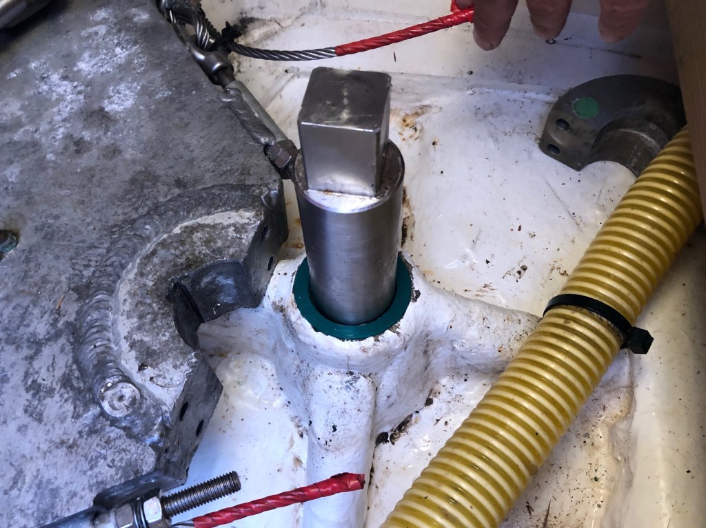 Finally, to update you about the rudder seals. After seeking advice from other sailors in the marina and much head scratching, it was decided that we needed to push the bearing as far down as possible. This gave us just enough space to refit the retaining clip plus one of the two lip seals that had been purchased for the job.