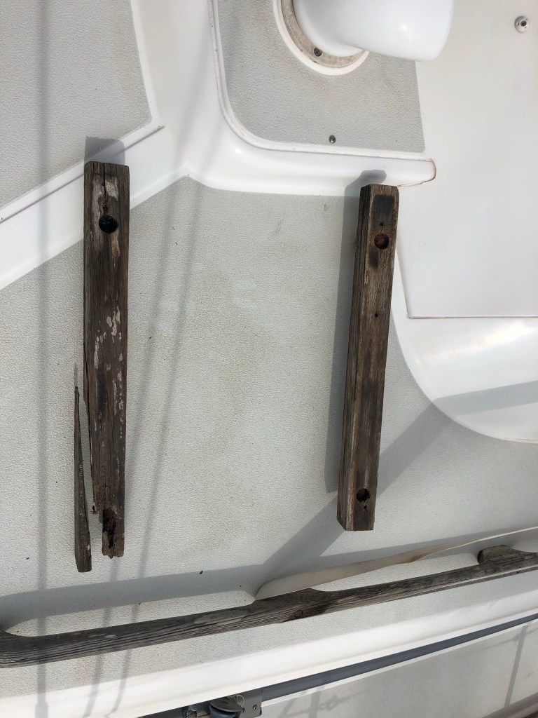 We recently had our life raft serviced and as always on a boat, one job leads to another. When we removed it from the deck, we noticed that the wooden mounts were rotten and needed replacing.