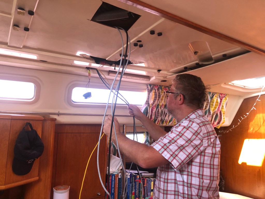 We have one more job that we wanted to do before leaving and that was to wire in the new chart plotter. We took the opportunity while the headlining was down to run cables from the cockpit instrument panel, along the small void between ceiling and the coach roof, down to the electrical cupboard.