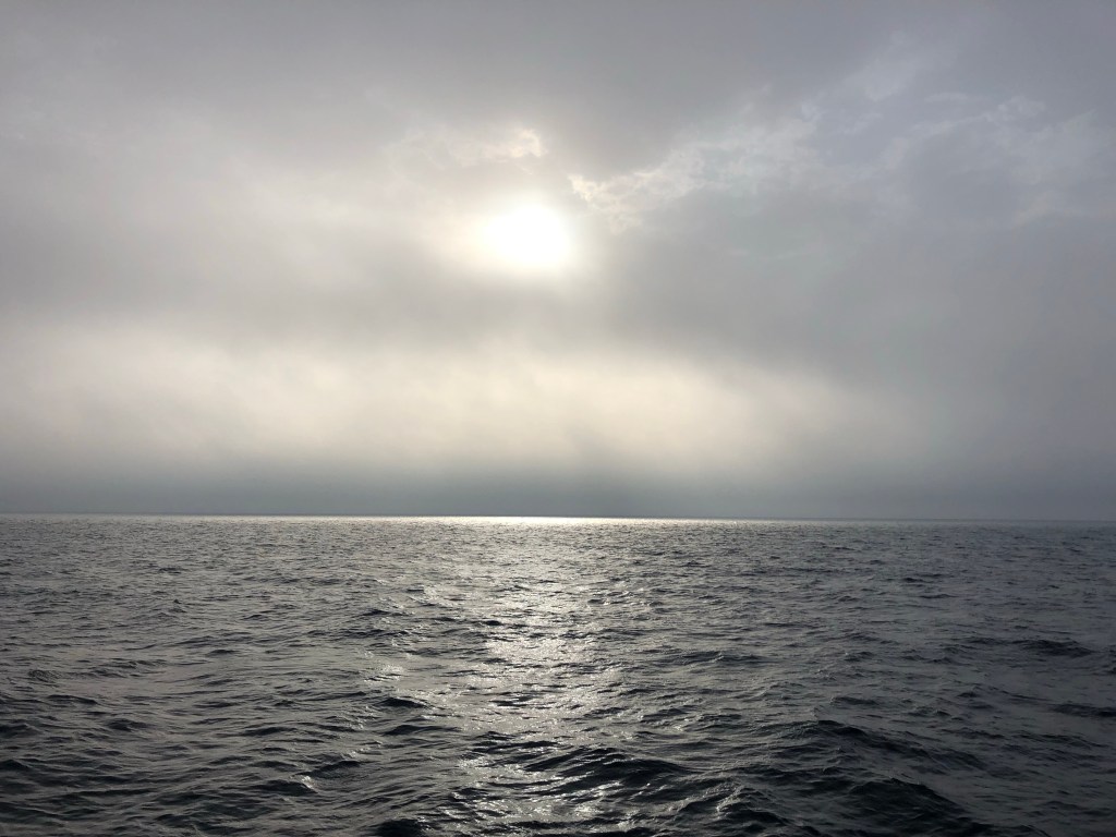 Eventually the wind died, the engine came on and we motored through the night. We had an uneventful night, unfortunately the cloud returned so we couldn’t see the sunset, moon or sunrise, just some bioluminescence in the water created by our wake