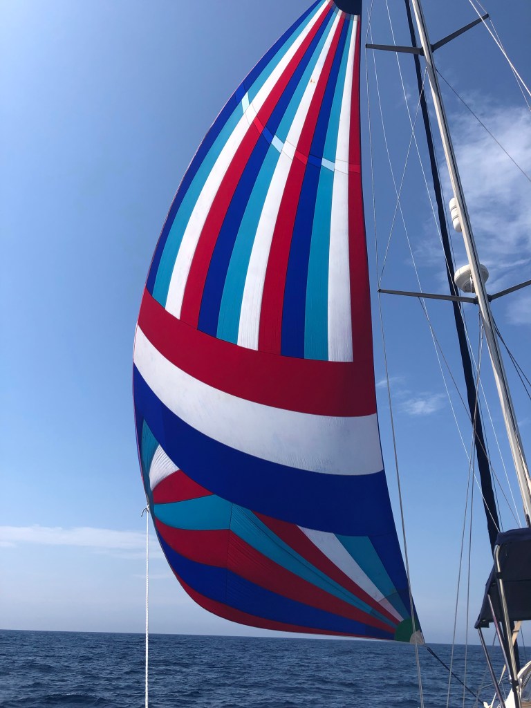 The passage was almost due north for 150 nm so would be an overnight crossing. We motored out of the anchorage and after about half an hour, the cloud started to break up, we had a force 3-4 southeasterly wind and the sails went up. By late afternoon the wind shifted direction and dropped, so we raised ‘the beast’ to enable us to continue sailing (slowly). We had to head slightly off course for a while to keep the wind in the sail but it was very comfortable with very little swell.