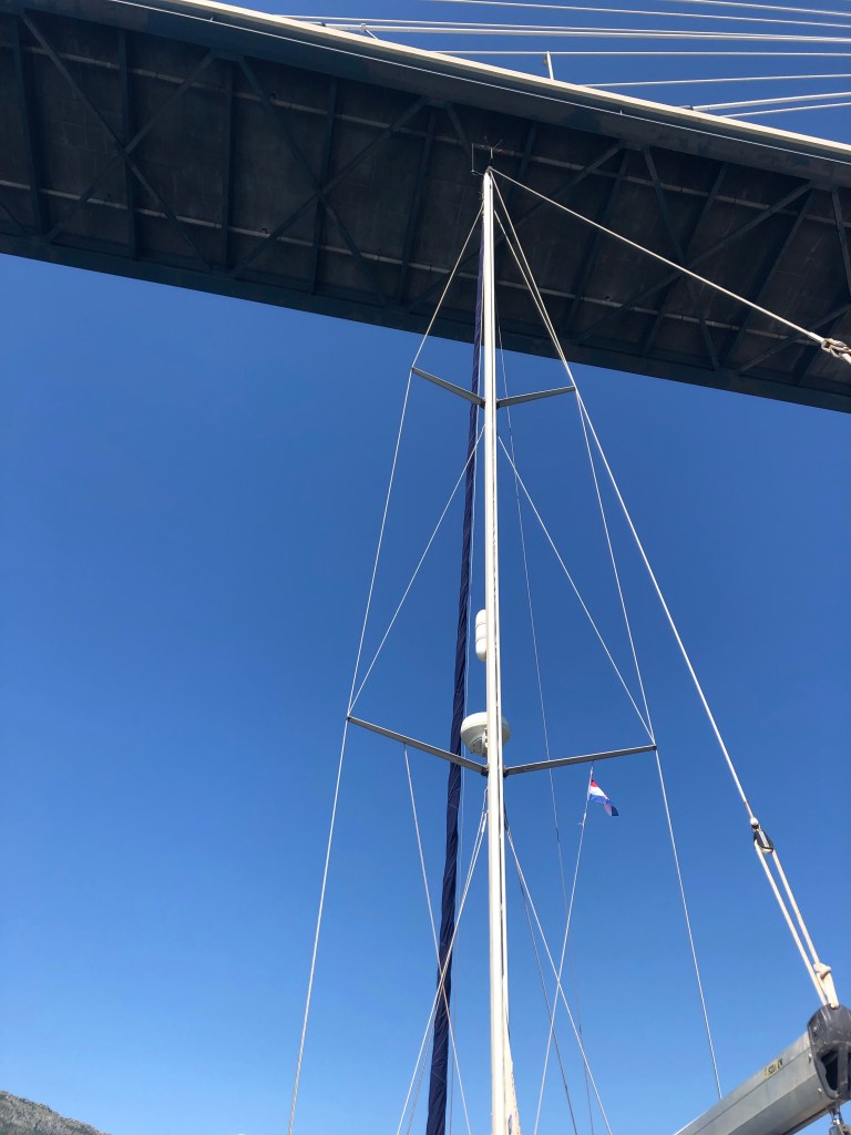 The Croatian authorities are very strict with their entry procedures, so we first had to go to the customs dock in Gruž. Having already prepared all of the documents, it took less than an hour to check in (and pay all of the cruising fees) and we were given permission to stay in Croatia for 90 days. We then headed around the corner, under the bridge to the marina where we had booked a berth for the night. Will we fit under this bridge?