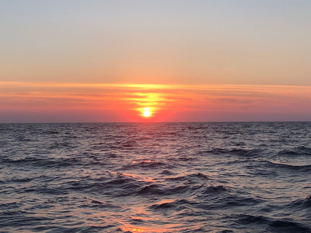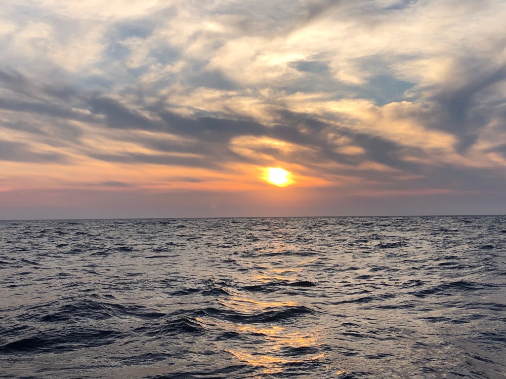 The wind picked up at 3am so the sails went up again for a few hours. Still alone at sea, the sun rose through the morning clouds for day 2 of our journey.
