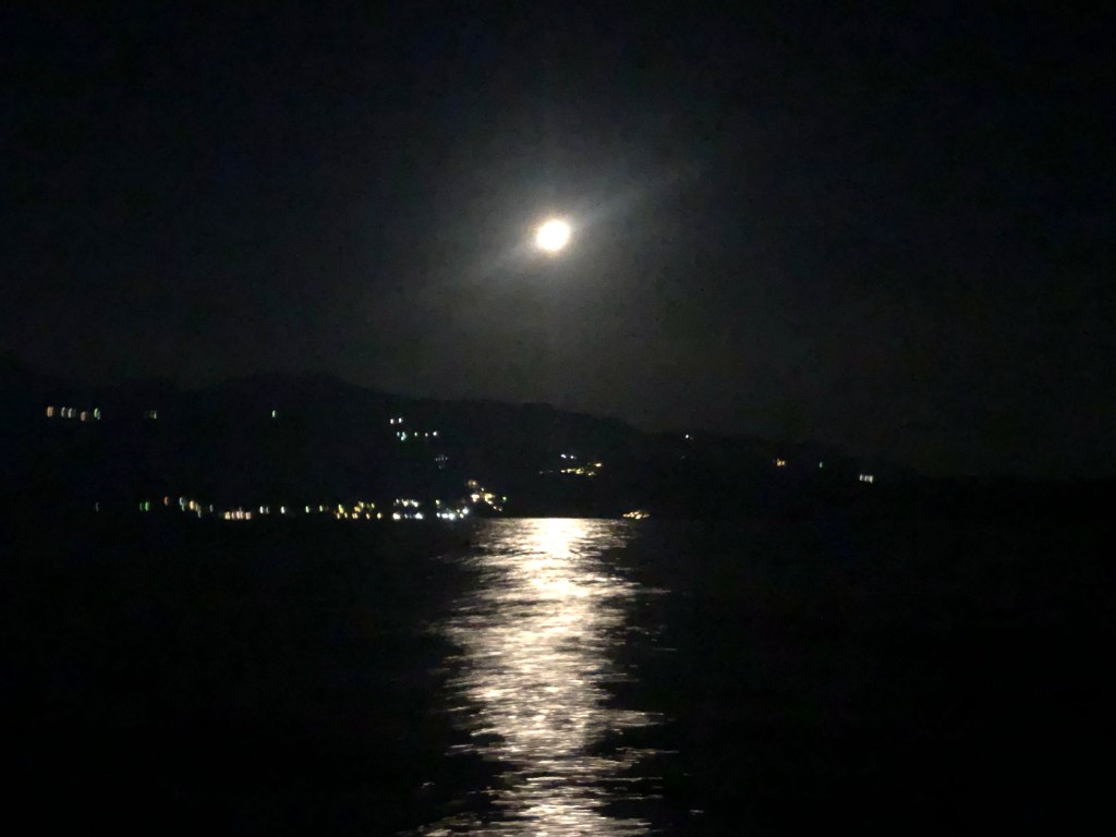 We continued through the channel between Corfu and Albania avoiding the rocks, these were all well marked on the charts and had corresponding lights to aid navigation. The bright half moon set early again behind the mountains of Corfu.