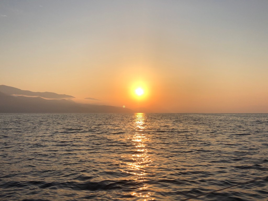 Day 3 and the sun rose over mainland Greece bringing the wind back with it, giving us a few more hours of sailing.