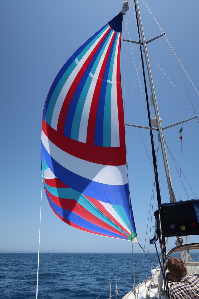 Once the wind started to increase we needed to take down the cruising chute but it somehow got stuck halfway down. At this point we thought that we may have to revert to plan A and go into Crotone to get up the mast and release it. Paul resorted to laying down on the deck with his binoculars to try and identify what was happening at the top of the mast. Although this was not conclusive it did give us the confidence to give an extra hard tug on the offending halyard which had the desired effect and the sail came flying down.