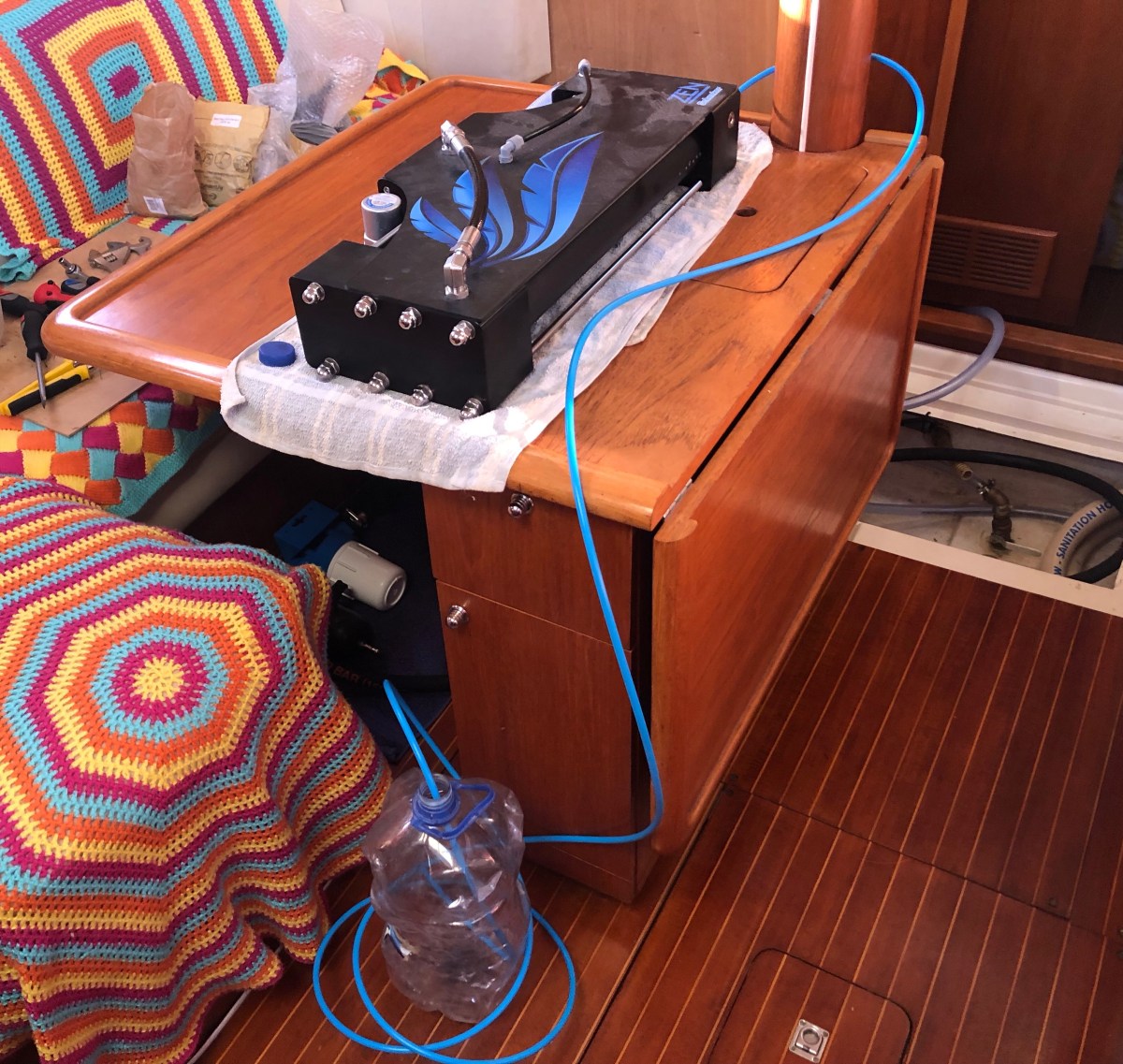 We had the water maker set up on the table in the saloon as a temporary arrangement to test that everything worked, it still needs to be installed and plumbed in permanently but we need some more fittings for that. The waste pipe was draining into the sink in the forward heads but after making water for a while, we noticed that the pipe had flipped out of the sink and flooded the heads! We then tied it down more securely.