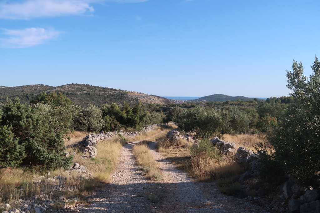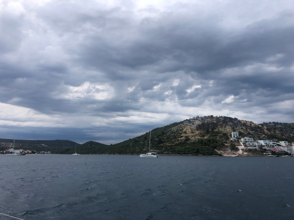 The following day we lifted our anchor and motored out of the bay. With 15kts of wind behind us we turned off the engine and sailed north with the Genoa only. There were more strong winds forecasted over the next couple of days so we headed to Rogoznica and anchored in Podglavica, a large bay to the east of the town, where we would be sheltered from the forthcoming storms.