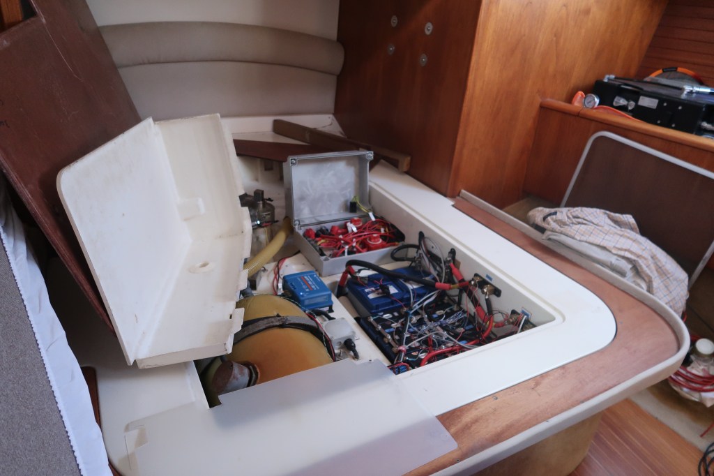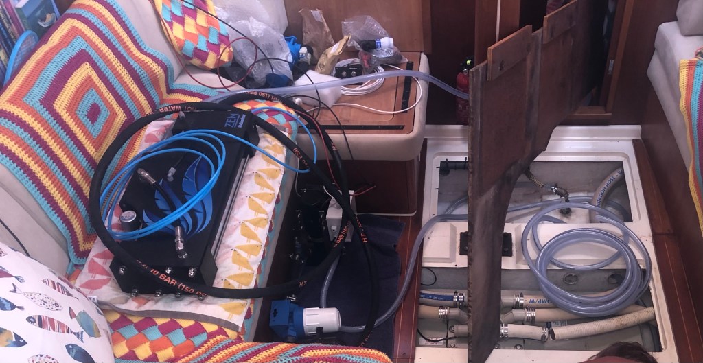 We had nearly run out of fresh water in our tanks, this normally meant that we would have to go into a costly marina to refill. However, we recently invested in a water maker which hadn’t yet been installed, so Paul got to work and connected it all up, which of course involved taking the boat apart again!