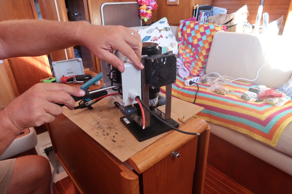 It wasn’t long before it was ready to switch on. With anticipation we fired it up and started converting sea water into fresh water using only the power from the sun on our solar panels. We were also pleased to see that there were no leaks anywhere….yet!