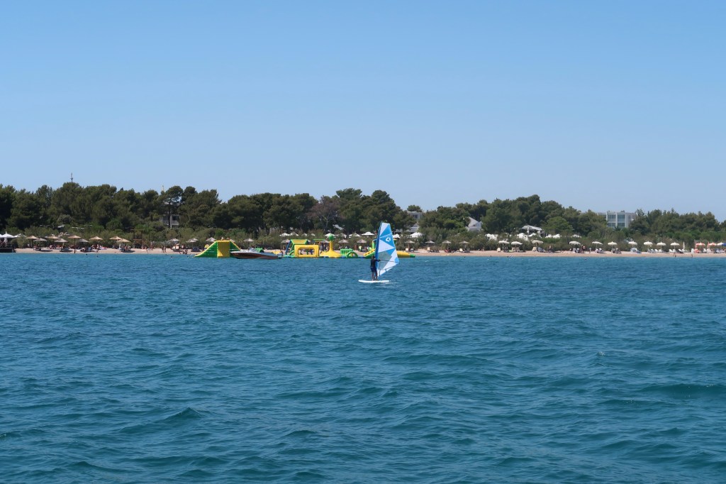 We anchored just north of Rezalište in the bay known as Šibernik Aquaparc which is a large shallow bay with beaches, water parks and a holiday resort. It was unusual to find that we were the only boat there which made us wonder if everyone knew something that we didn’t! We made the most of having plenty of space and dropped 50m of chain in a depth of 5m, giving us good holding ready for the strong winds which were due to blow the following morning.