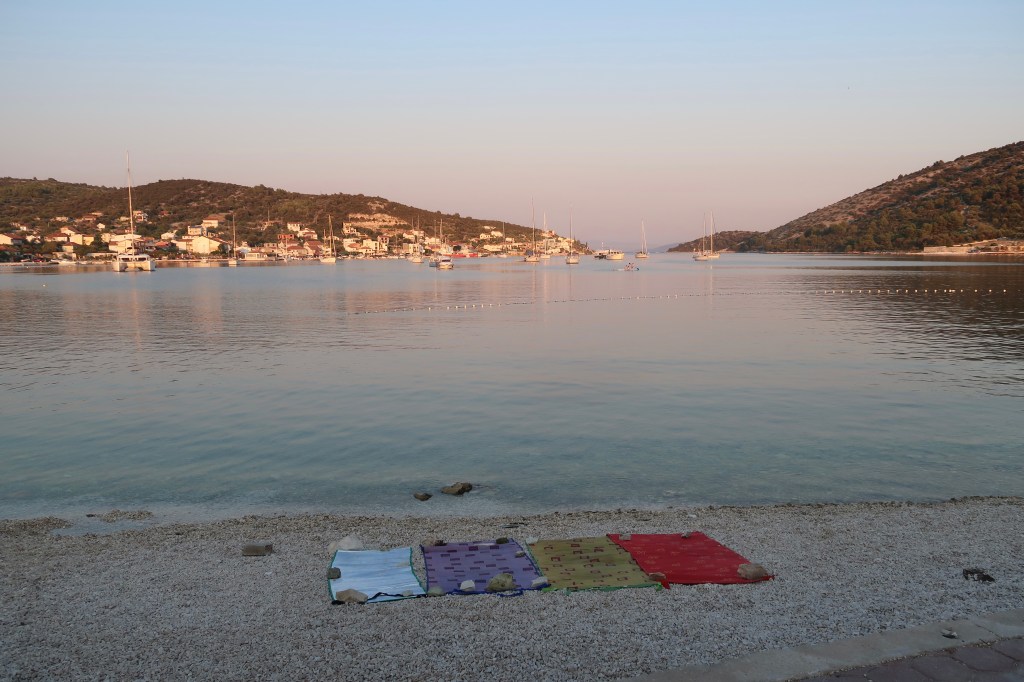 After anchoring in the large bay at Vinišće, we launched Ed and Fred and went to shore. As we also didn’t have much food on board we decided to treat ourselves to dinner before going to the grocery store. We sat down at a beachside table at a restaurant which we had heard has good food at a reasonable price and waited for some time before being served, by this point Paul was gagging for a beer!