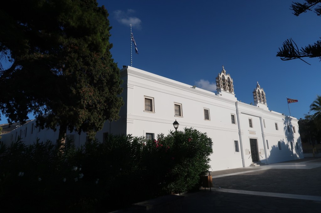 There are many churches, the most important and oldest being the 4th century Byzantine Church of Panagia Ekatontapiliani (Our Lady of the Hundred Doors). It is considered as one of the most important Byzantine monuments still standing in Greece with the building works being initiated by Helena the mother of Constantine the Great.