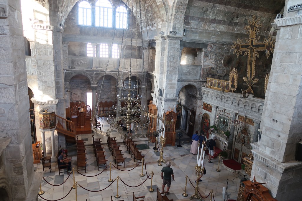 It is located 171 meters above sea level and has great views from the entrance over the Aegean Sea, surrounding inlets, rocks and over to Paros.