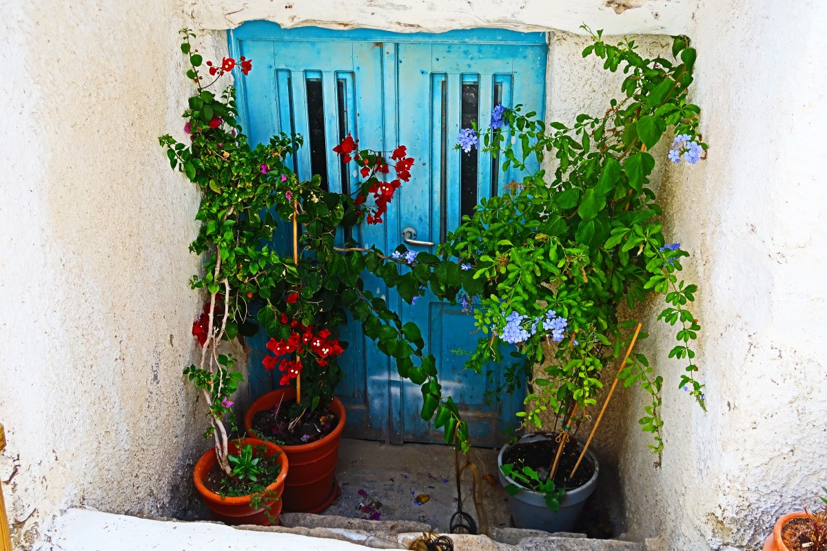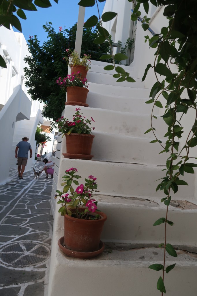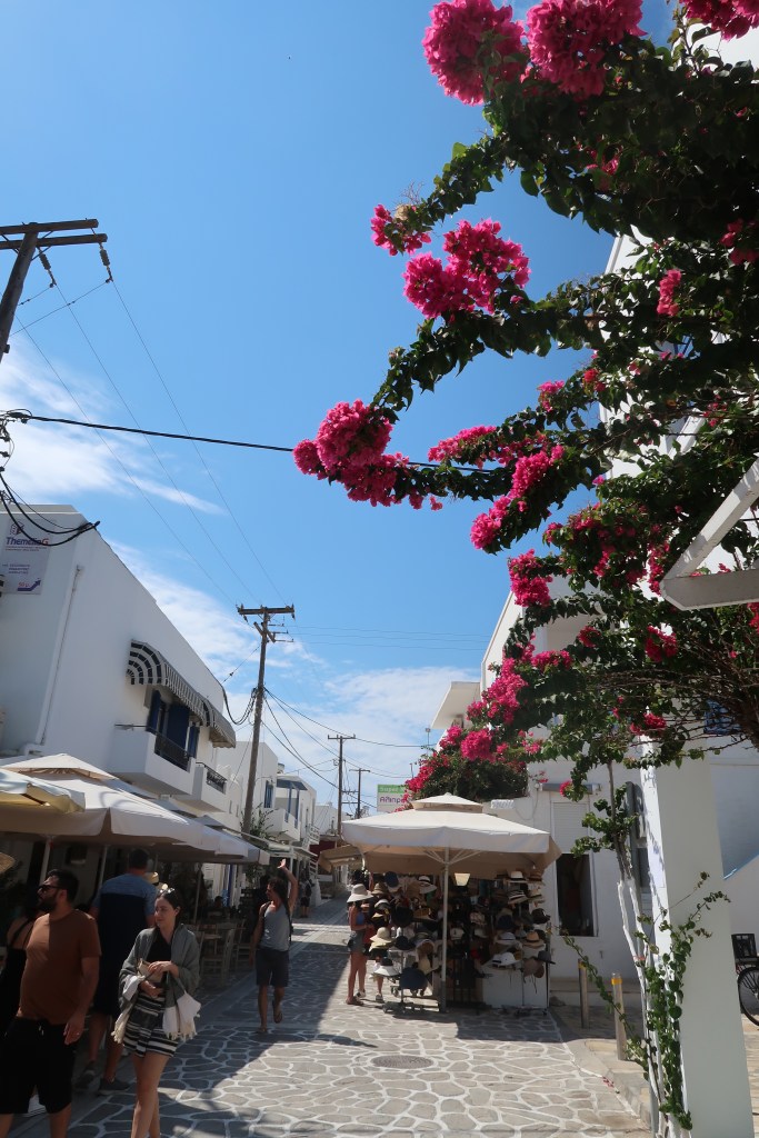 Much of the traditional Cycladic architecture has been maintained here and it is full of whitewashed cubic houses with blue shutters and wooden doors. A labyrinth of narrow alleyways wind around the houses with overhanging colourful flowers.