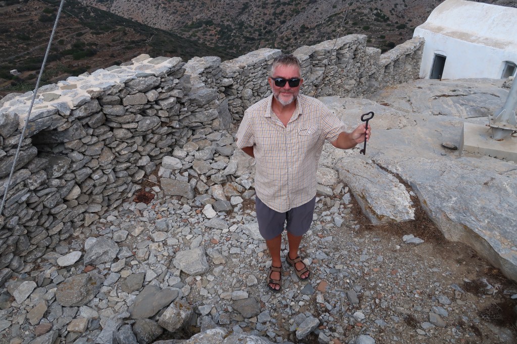 There are the ruins of a small 13th century Venetian castle overlooking the town so we walked up more steps to go and have a look. Unfortunately all the doors were locked, but we discovered that you can collect the key from one of the cafes below. We went down to collect the very large key and then back up for a private viewing. Another very low door, obviously people were a lot smaller in those days! There wasn’t much inside but great views over the town and a lovely spot to eat our cheese and spinach pies from the local bakery.