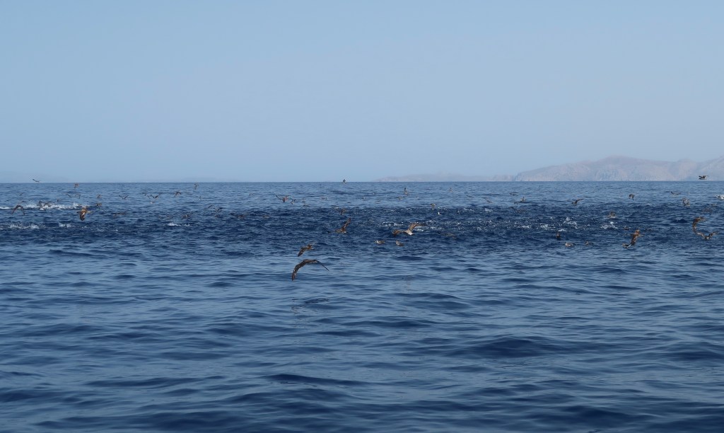 There was some disturbance in the water and fish were jumping out, it seemed that they were being chased by something under the water, and then the birds descended, attacking them from above as well.
