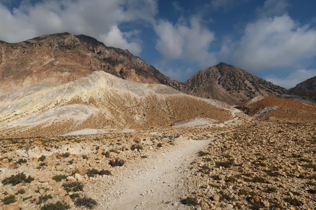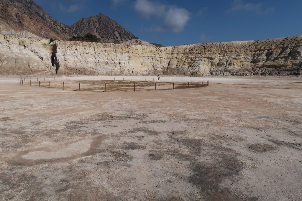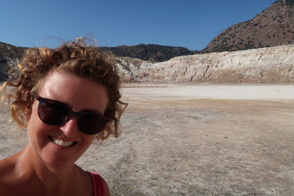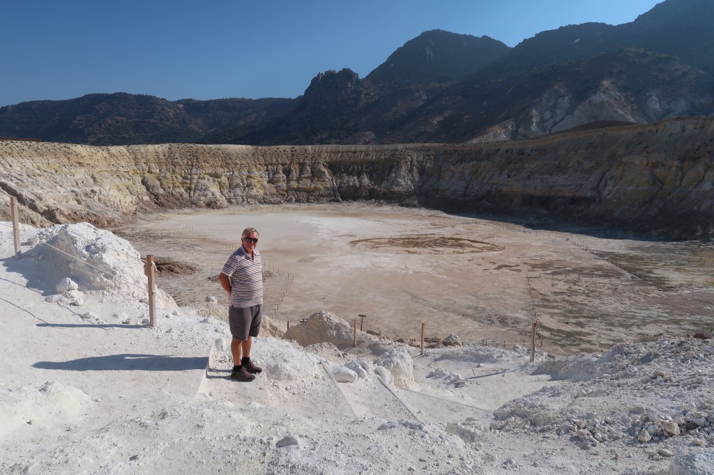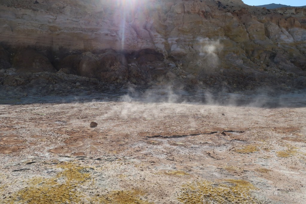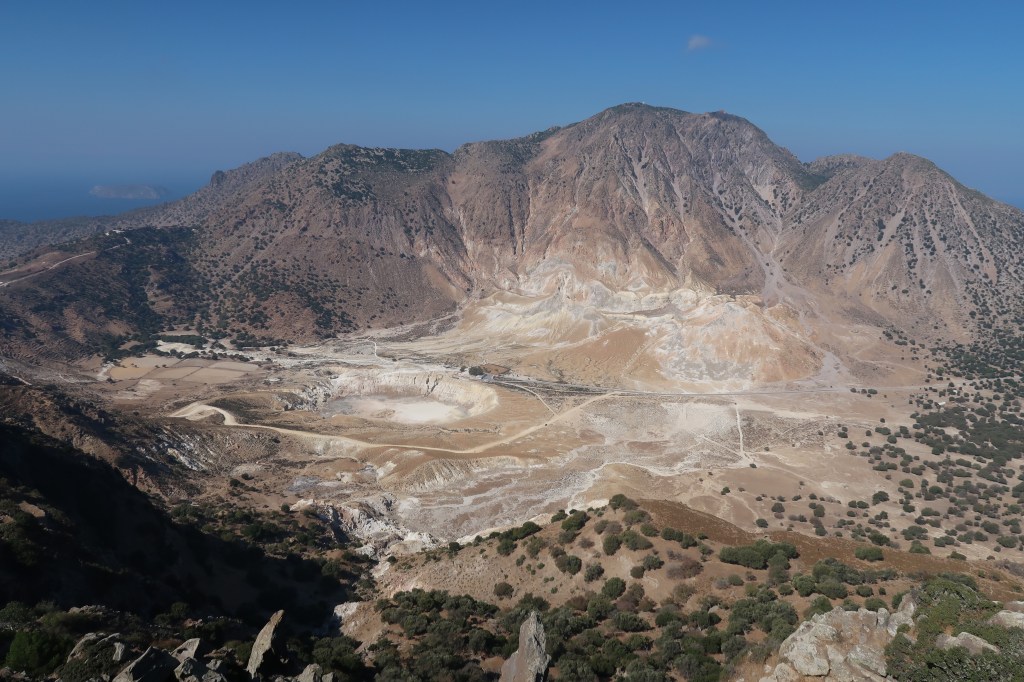 Once the smell and heat had overpowered us we went back down to explore the largest hydrothermal crater on Nisyros and one of the largest of its kind in the world. Named Stefanos, it measures 260m x 350m with a depth of 27m. Like the other smaller craters, it has been formed by steamy explosions of gas. We were able to go down into this crater, and walk around the hot surface, steam was puffing out of cracks in the ground giving of a smell of sulphur, which we were now starting to get used to.