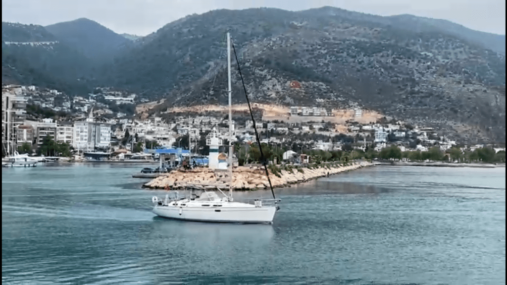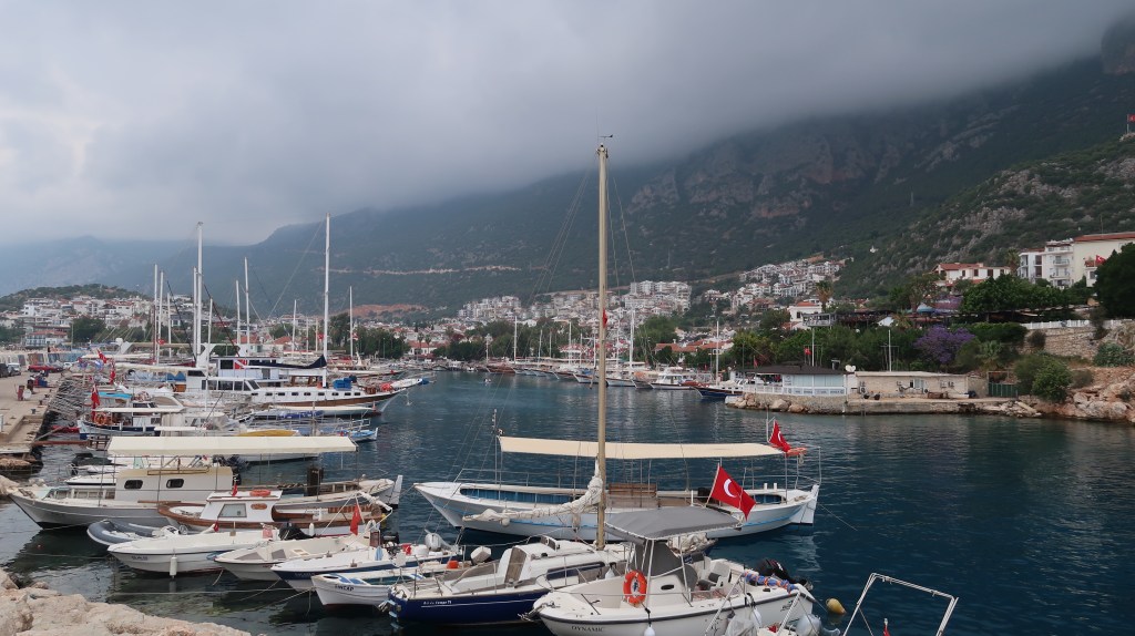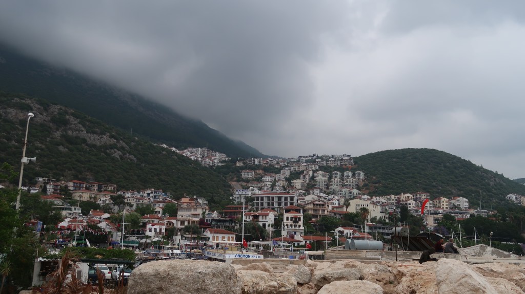 Following a night of heavy rain it had started to slow down by the morning so we lifted the anchor between showers and continued another 20nm to Kaş. Again the wind was very light so we had to motor all of the way. On arrival at Kaş harbour, and with more storms forecast, we moored in the marina. The sky was full of rain clouds on top of the surrounding hills but thankfully the rain stayed away.