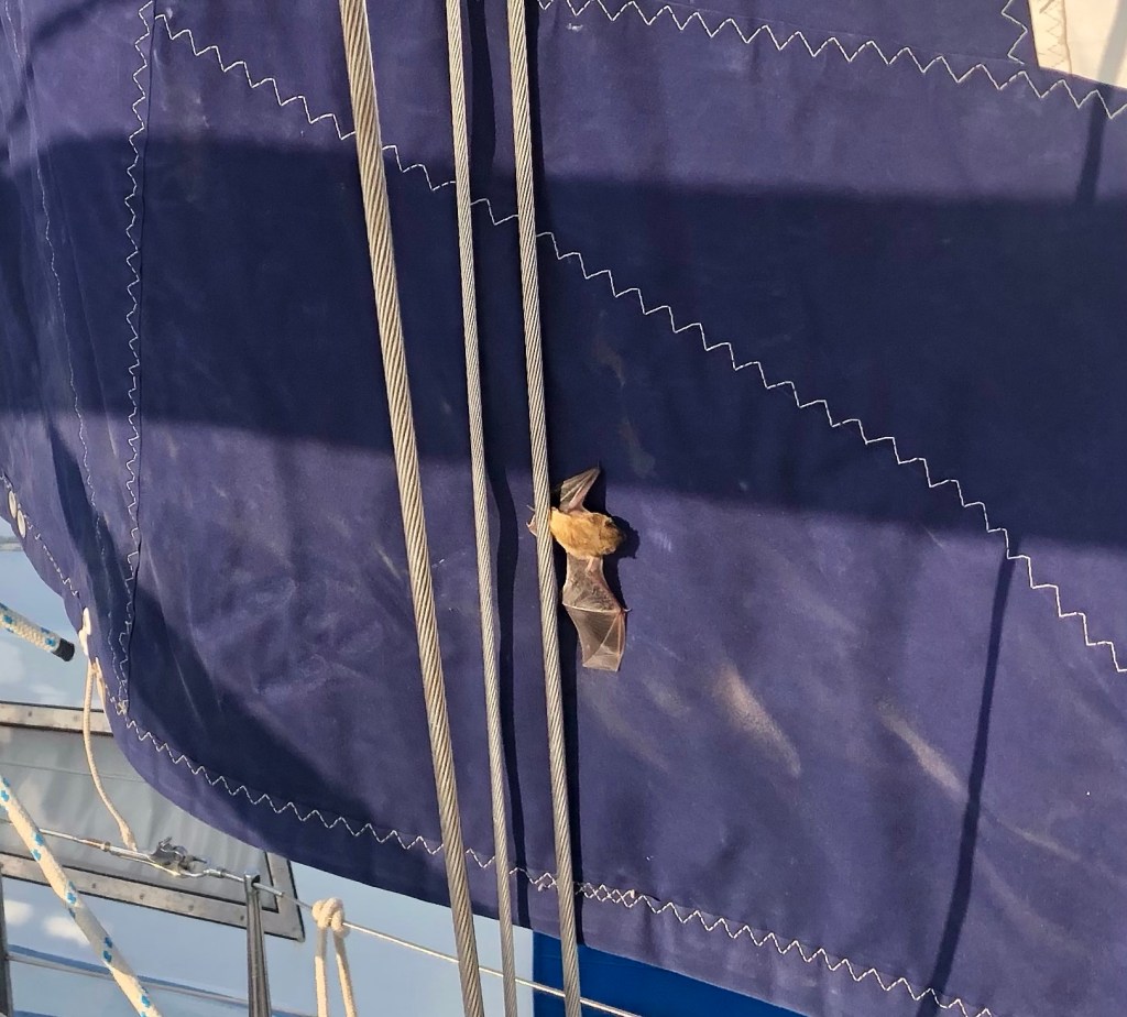 Finally it was time to slip our lines and leave Finike marina. Before we set off there was just a few routine checks to be done, one being the sails. We had left the sails on through the winter so on a nice windless morning we unfurled them to have a look how they had survived. Starting with the Genoa, we pulled it out and noticed a small lump attached, at first it looked like a tiny bird, but on closer inspection realised it was a bat.