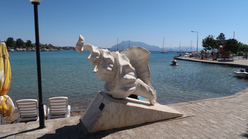 We walked through the town with many seaside statues, along the beach where the sun beds were waiting to be filled and around the small harbour, before succumbing to the lure of one of the restaurants. It was a Sunday morning and the tradition is for families to indulge in a full Turkish breakfast, so we sat down to join them.
