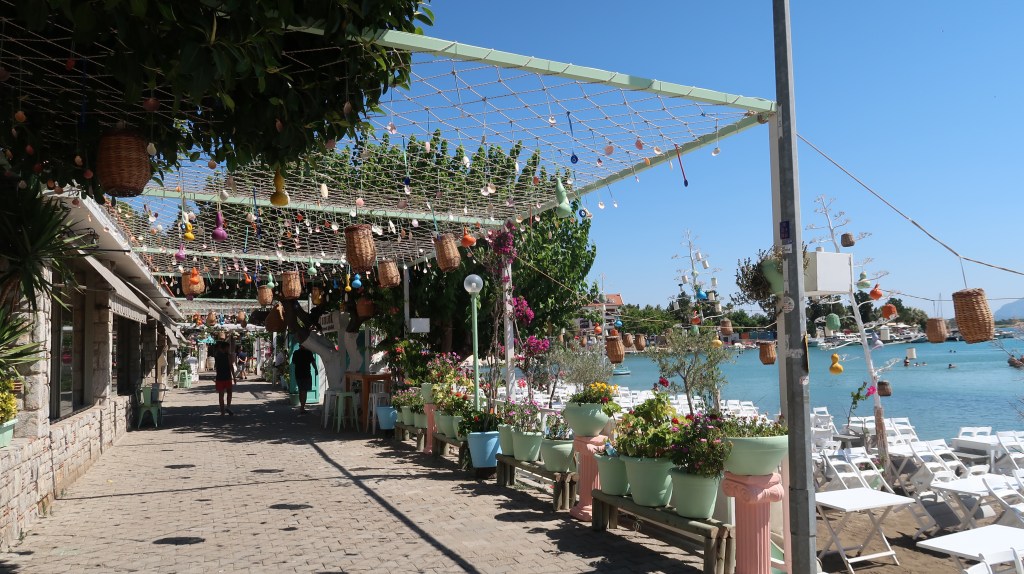 The waterfront is now aimed at tourists, the beaches are all laid out with sun beds, and there are many decorated cafes and restaurants along the promenade spilling onto the beach, all trying to entice you in as you pass.