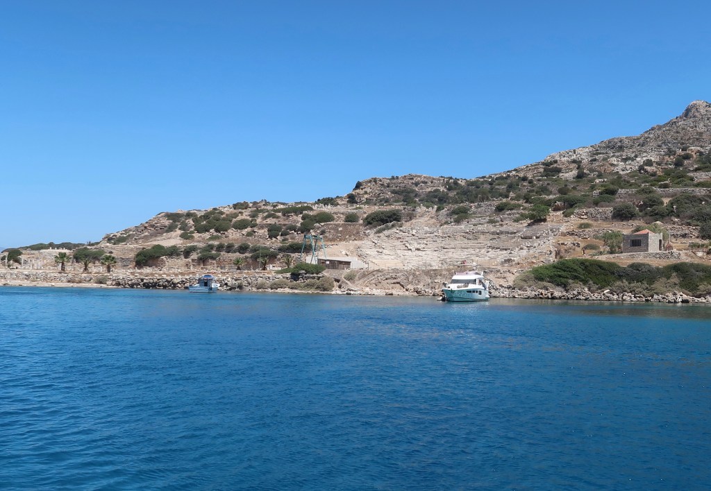 We anchored in the small harbour, the seabed is sand and weed but the water was so clear it was easy to target a nice sandy patch to drop the anchor with a great view of the remains of the ancient city spread out on terraces over the hillside.