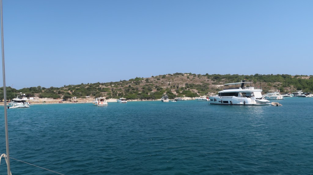 There was due to be a northerly wind blowing all week so our options for calm anchorages was slightly limited, but we were confident that we had found a couple of good protected bays which would be suitable. We headed to Hacettepe Koyu to await their arrival. It was quite busy but we managed to find a spot where we could anchor in 6 meters with enough space to let out 40m of chain to ensure good holding.