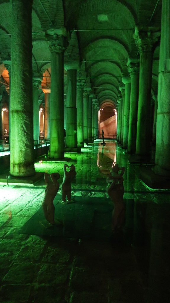 Once inside, we had to descend a large staircase into the old cistern where there are rows of columns, arches and modern statues, all dimly lit with different coloured lighting and reflecting on the water, making it feel very mysterious.