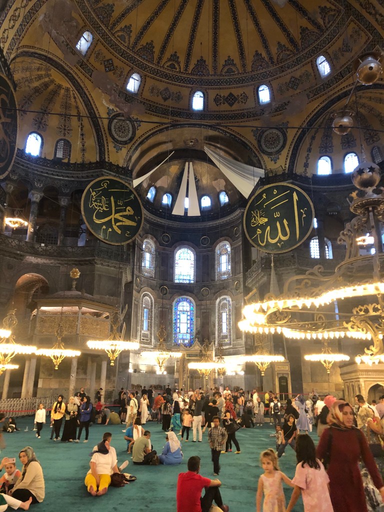 The Hagia Sophia is known for its Grand Central Dome, intricate mosaics, and delicate stonework. The massive dome spans 31 metres in diameter and rises to a height of over 55 metres. The dome was a technological marvel of its time as the building was designed to bear the weight of the massive structure without the need for support columns. It was very busy inside with a mix of tourists and worshippers.