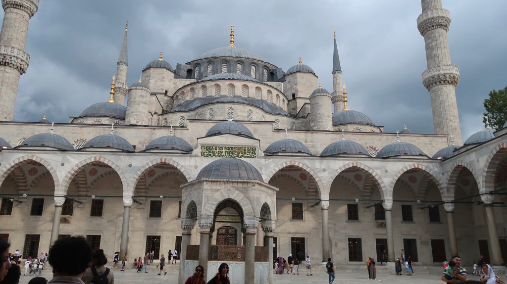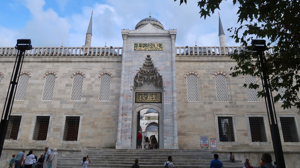The mosque has a classical Ottoman layout with a central dome surrounded by four semi-domes over the prayer hall. It has six minarets, four on the corners of the mosque and two on the corners of the courtyard, more than any mosque in Istanbul. This provoked hostility at the time, as the Prophet’s mosque in Mecca had six minarets, the sultan was criticized for thinking a bit too highly of himself. Legend has it that the sultan overcame the problem by paying for a seventh minaret at the mosque in Mecca.