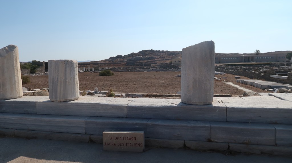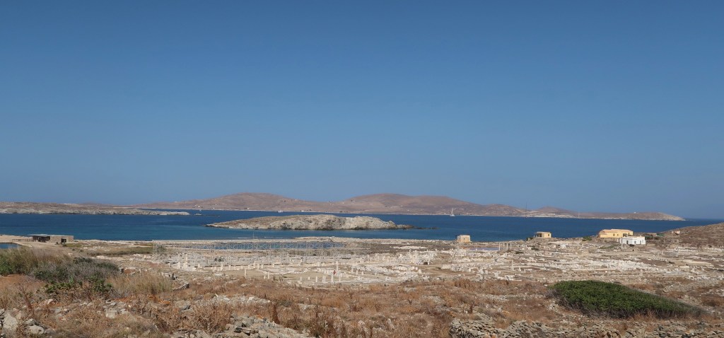 Nisos Rineia is very close to Delos, so the following morning we took Ed and Fred one and a half miles to the ancient site. This is the furthest we have ventured with them and was a little apprehensive particularly as we had recently lost one of our oars, but Ed has been behaving very well this year, so we set off. It was calm in the protection of the anchorage but once into the channel between the islands Fred was bouncing happily over the waves. We left early to beat the crowds and were the first to arrive, it was nice to have the site to ourselves again.