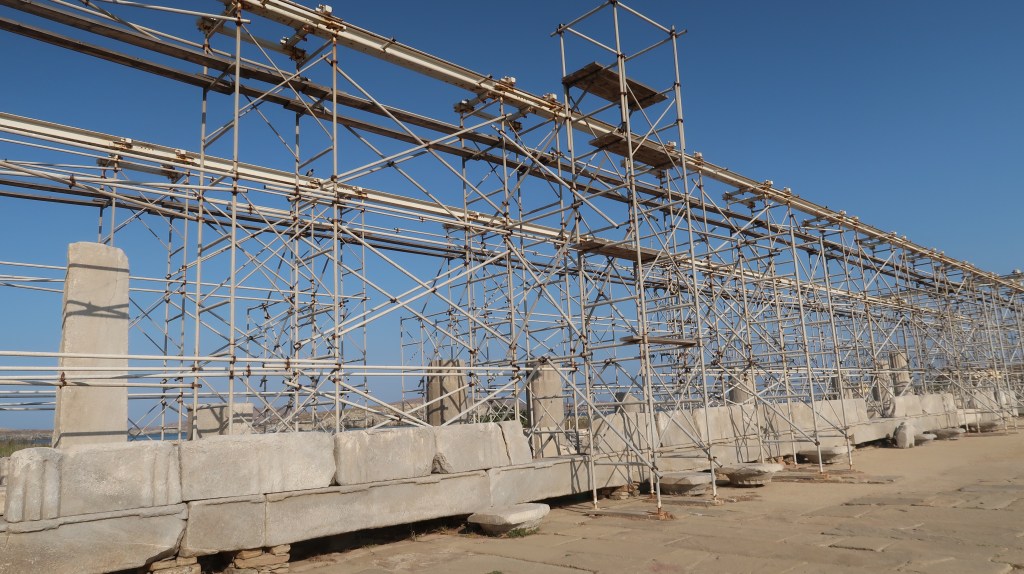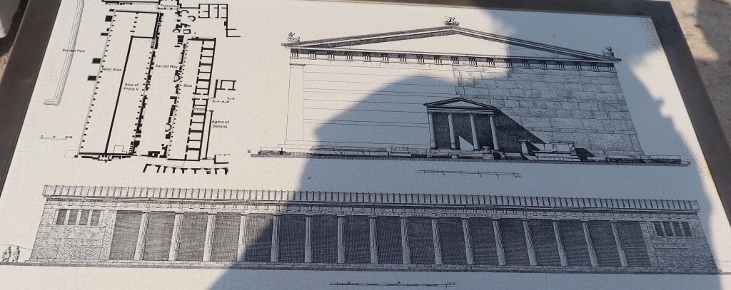 Rulers of state competed with each other to build the most magnificent buildings to show wealth and power. In the 3rd century the kings of Pergamum built a large portico on the east side of the sacred way that led from the port to the sanctuary. An even larger one, dedicated to Apollo, was later built in the 2nd century by Philip V. This was undergoing reconstruction.