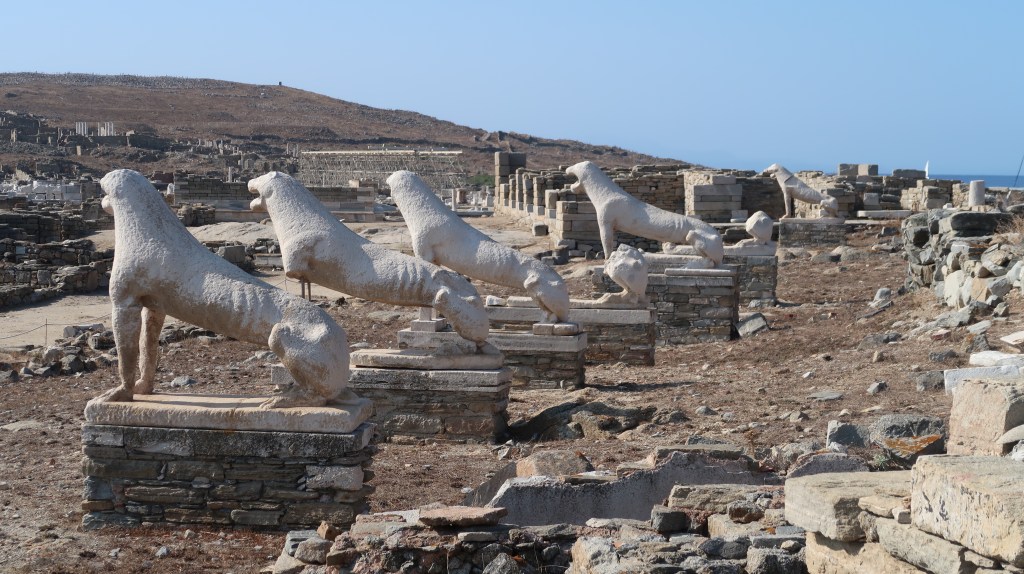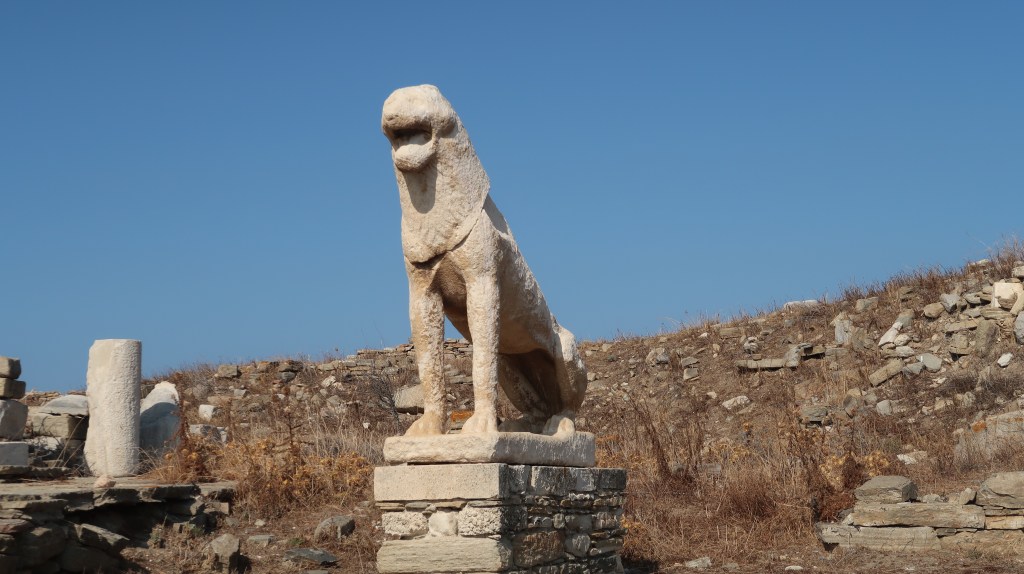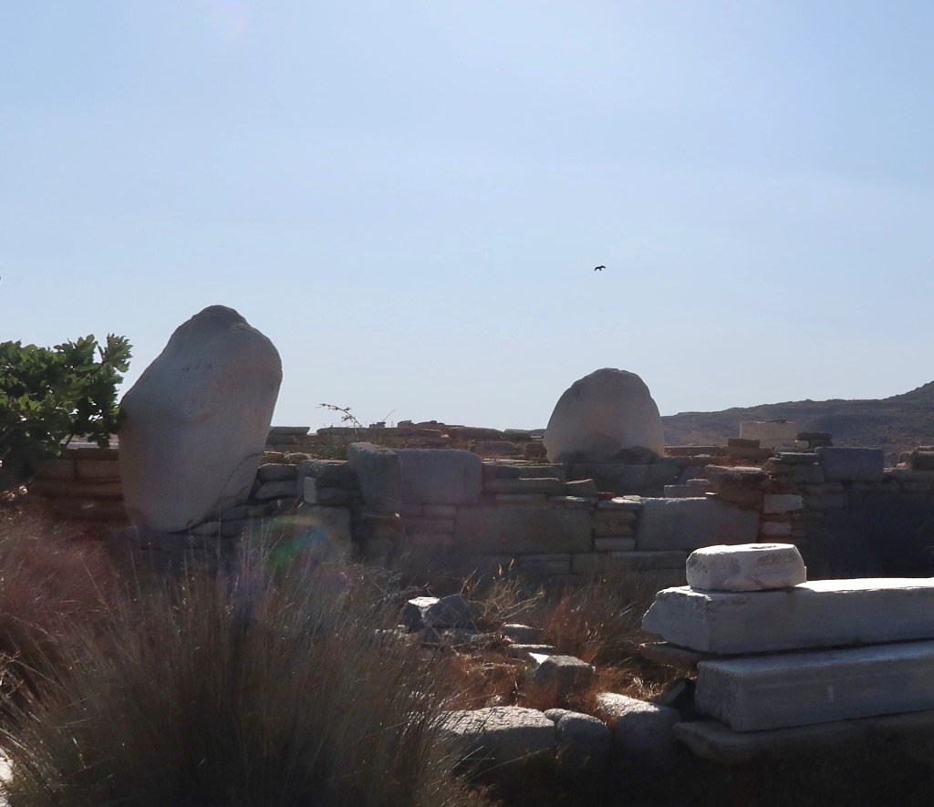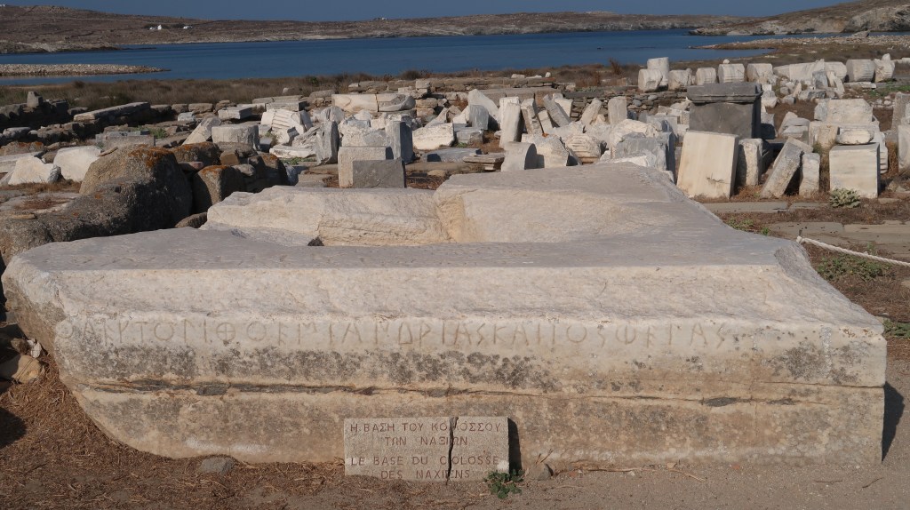 In the 6th century BC, the Oikos of the Naxians built a large building with 8 columns each side, made with granite blocks and marble. It is not certain what it was used for, many believe it was an early temple of Apollo. The building had a huge 32 tonne marble base which supported a towering colossus, a statue of Apollo 9m high, with an avenue of lions ending at its base. Inscribed on the base was ‘to Apollo from the Naxians’. Apparently a bronze palm tree fell on it and knocked it down. A thousand men tried and failed to raise it. Over the centuries, many attempts were made to haul away sections of the broken statue but were largely unsuccessful due to its weight, you can still see some of huge weathered stones amongst the ruins.