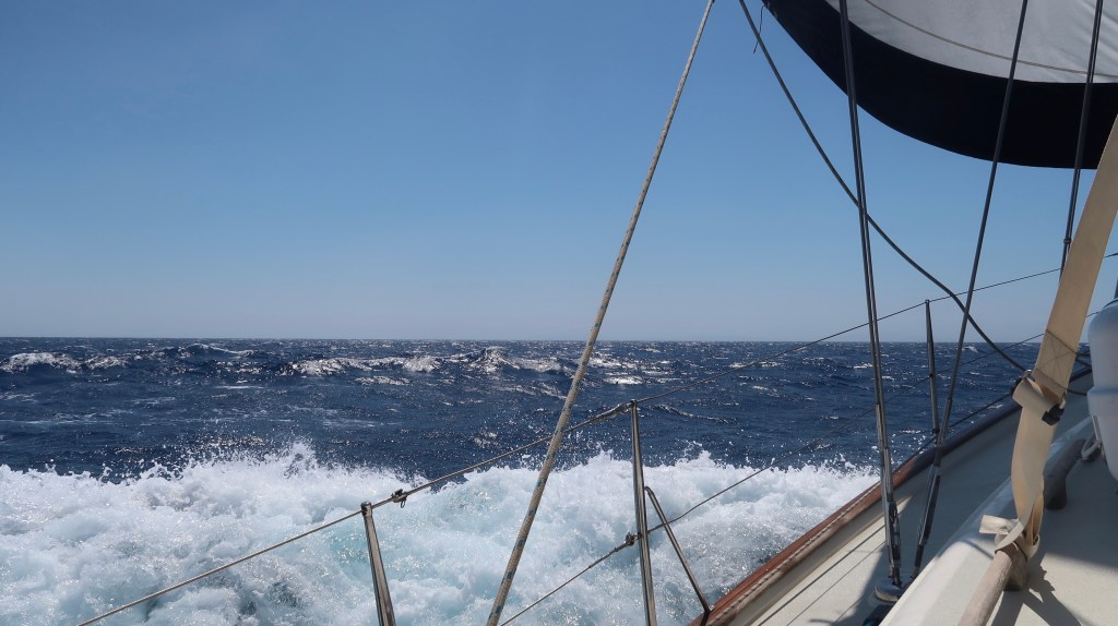 Once they had passed by, the wind picked up as did our speed and the swell, the wind continued to increase and we were flying along, Ziggy was ploughing through the big waves with a reef in both sails. Crossing this central stretch of the Aegean is known for its strong Meltemi winds and rough seas but we had picked a good day to enjoy a perfect fast sail.