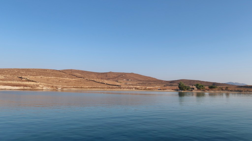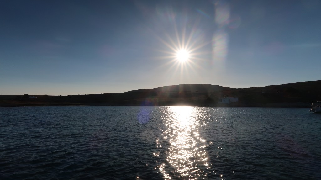 On approach to Mykonos we steered in to the lee of the island to drop the sails and motored into the main bay. Unfortunately, the anchorage was not very well protected from the swell and it would be uncomfortable to stay, so we decided to continue on another 5 nm to Nisos Rineia which offered much better protection. After avoiding the rocks at the entrance to the bay, we dropped our anchor in clear, calm water on the north side of Ormos Skhinou just as the sun was going behind the hills.