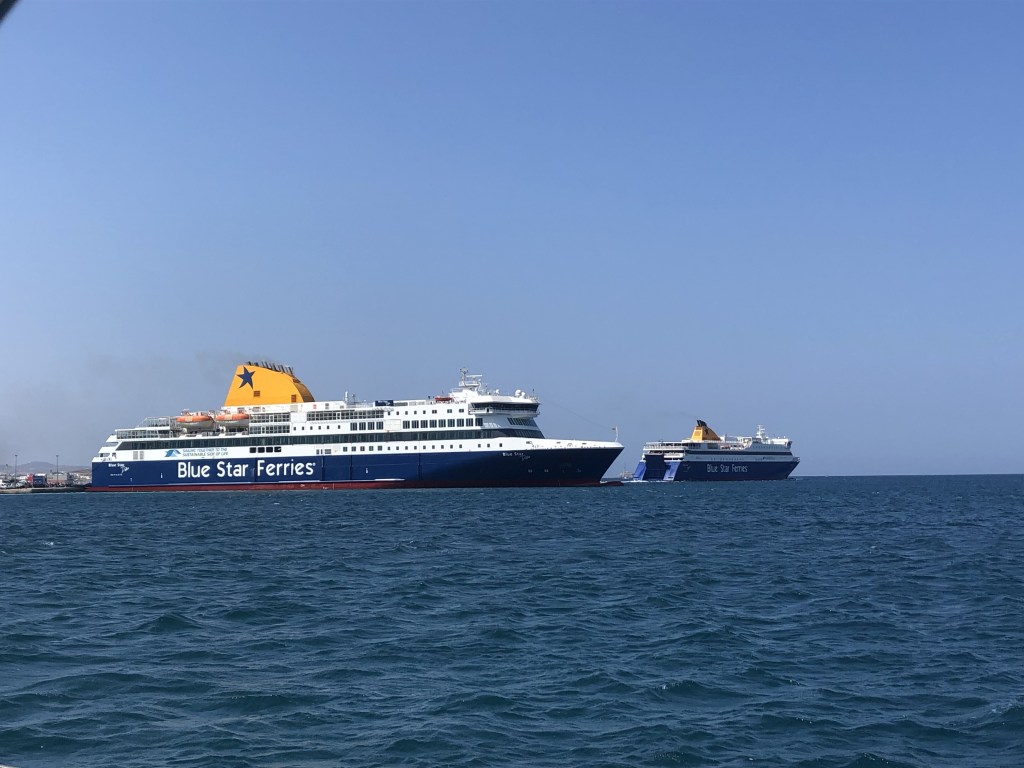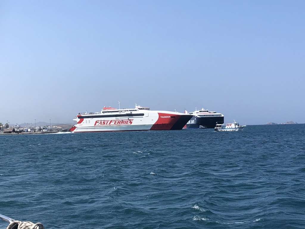 After a few days the wind turned back to the north so it was time to continue our journey another 25 nm southwest to Nisos Paros. The sea was a bit choppy but with 20 kts of wind from behind, Ziggy was again comfortably sailing at 6 kts with the Genoa only. The wind disappeared on our approach to the island and we had to motor the last few miles. We headed for the large anchorage at Paros town, avoiding all the ferries which constantly come and go into the bay, and dropped our anchor.
