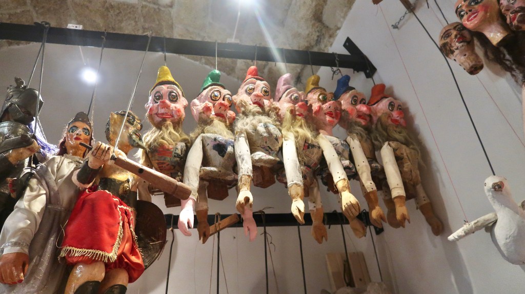 The small museum is home to puppets ranging from hand sized to nearly life size and weighing up to 16kg, including damsels in long elaborate dresses, knights in full body armor, and papier-mâché dragons, all produced in Ortigia.