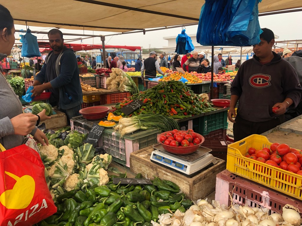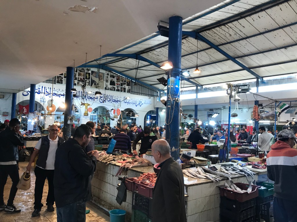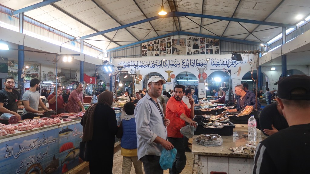 The old fishing port of Monastir, Port de Pêche, is a couple of miles around the coast. Here there is another larger market so I went along with some friends to see. This one is mostly outdoor, very busy with cars frequently driving through, I almost got hit more than once as cars edge their way past. Although it was larger, it still sold much of the same seasonal fresh produce. There is also a large clothing section which looked like heaps of clothes had been dumped in piles, we didn’t venture into this part.