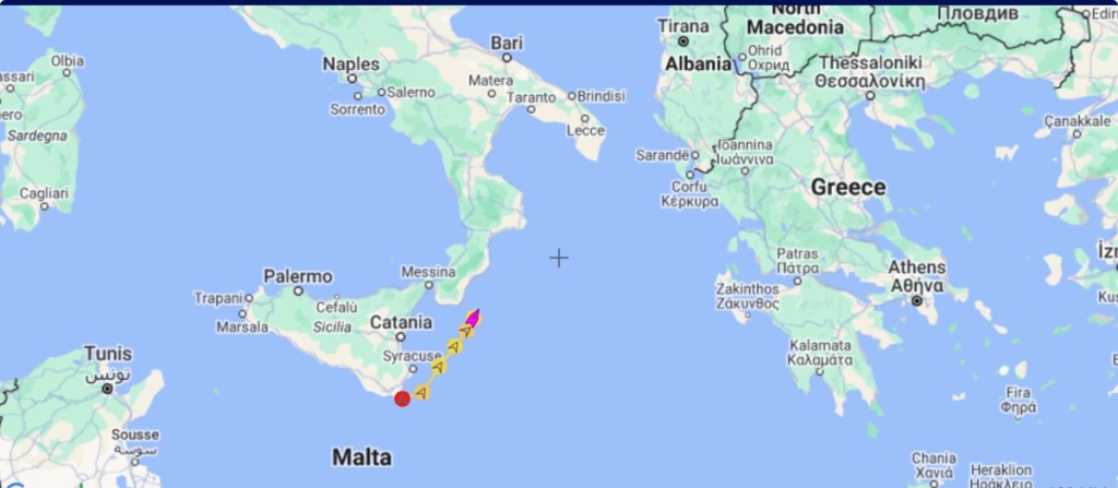 The next morning we lifted the anchor at first light and left the bay avoiding a stream of container ships on their way in. We set our course to head north towards Sicily. It was very hot and sunny with just a light breeze, we passed a group of dolphins but they weren’t interested in swimming along with us, it looked like they were busy trying to catch their lunch. We arrived at Porto Palo on the southeast tip of Sicily just before sunset and anchored for the night.